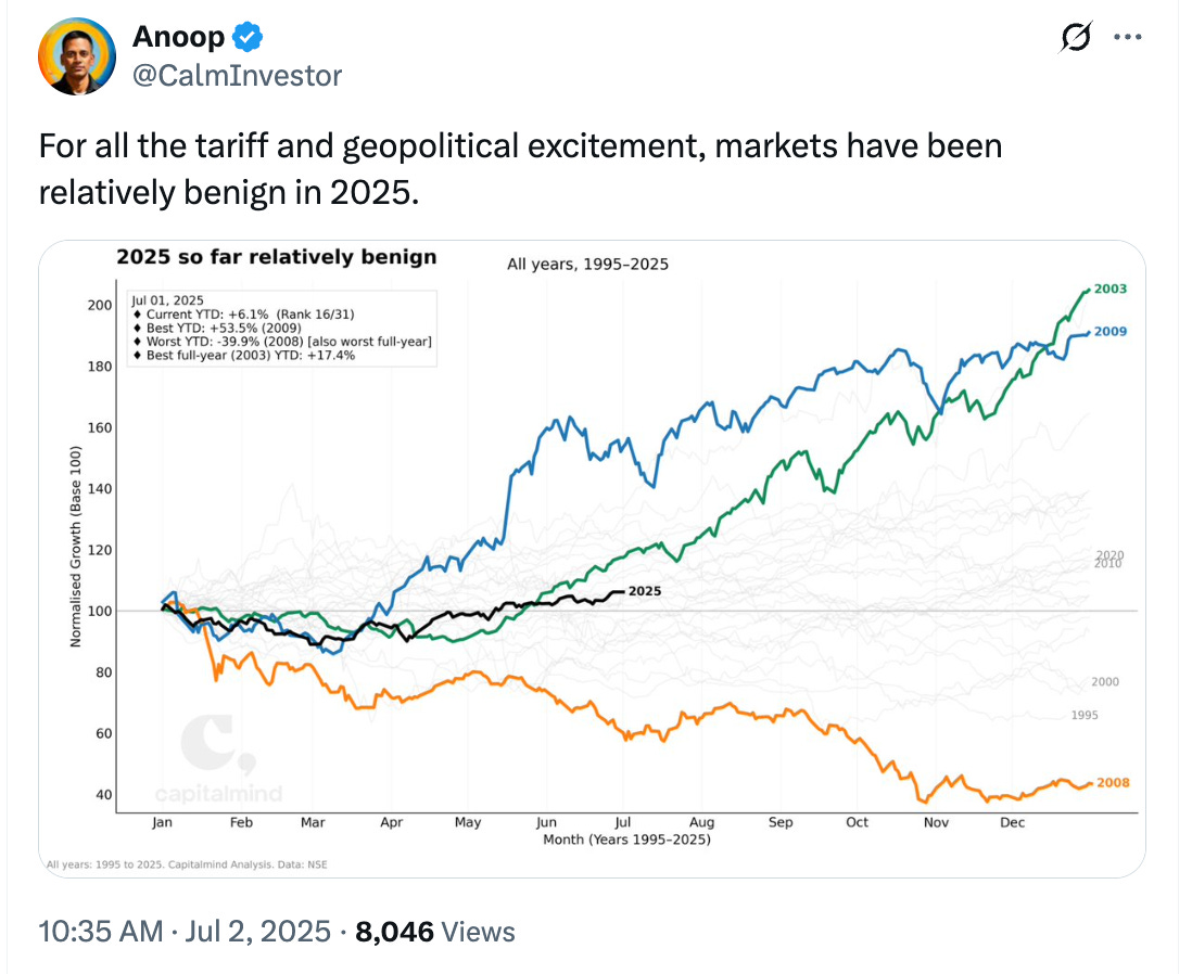 Fascinating chart showing the market movement across 30 years. Smart use of visual highlighting to make the outliers (and 2025) stand out.