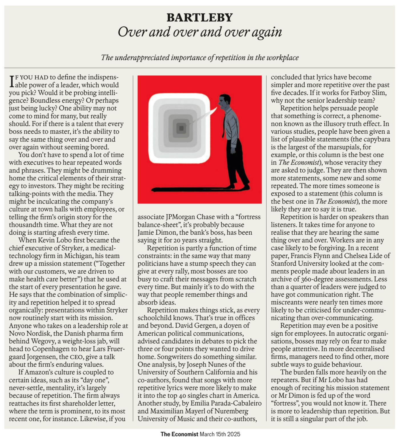 This Economist article was shared by advertising and personal branding expert, Karthik Srinivasan on LinkedIn and talks about the importance of repetition of key ideas by leaders.