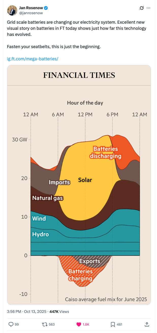 Cool chart – loved the way it shows both how batteries store energy during the day and discharge it during the night. Would be cool to see this mix from 10 years ago.