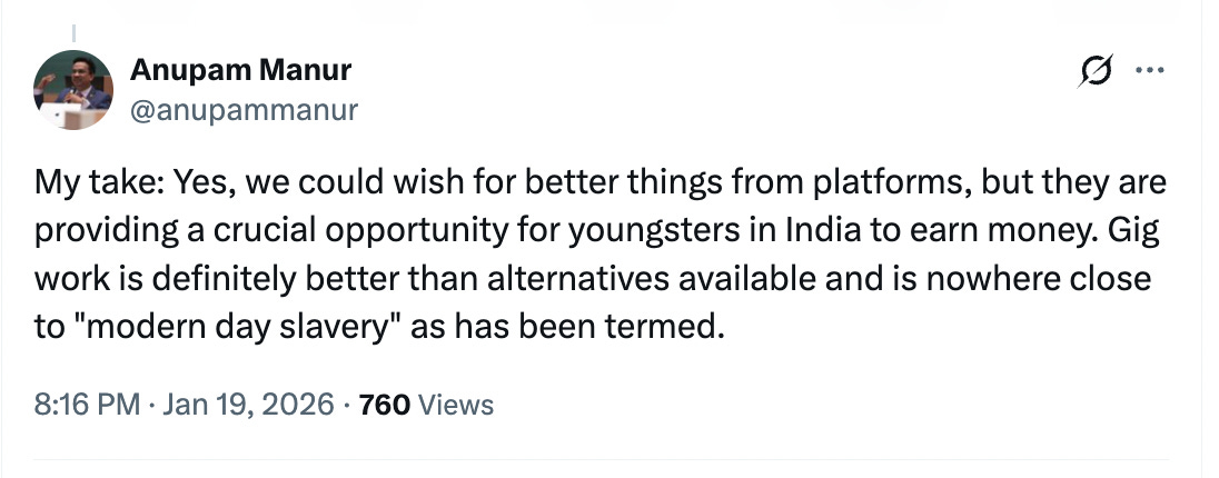 Very well argued thread by Anupam Manur. Don’t blindly criticise gig work without considering the counterfactual (the alternative employment sources) available to those looking for work.